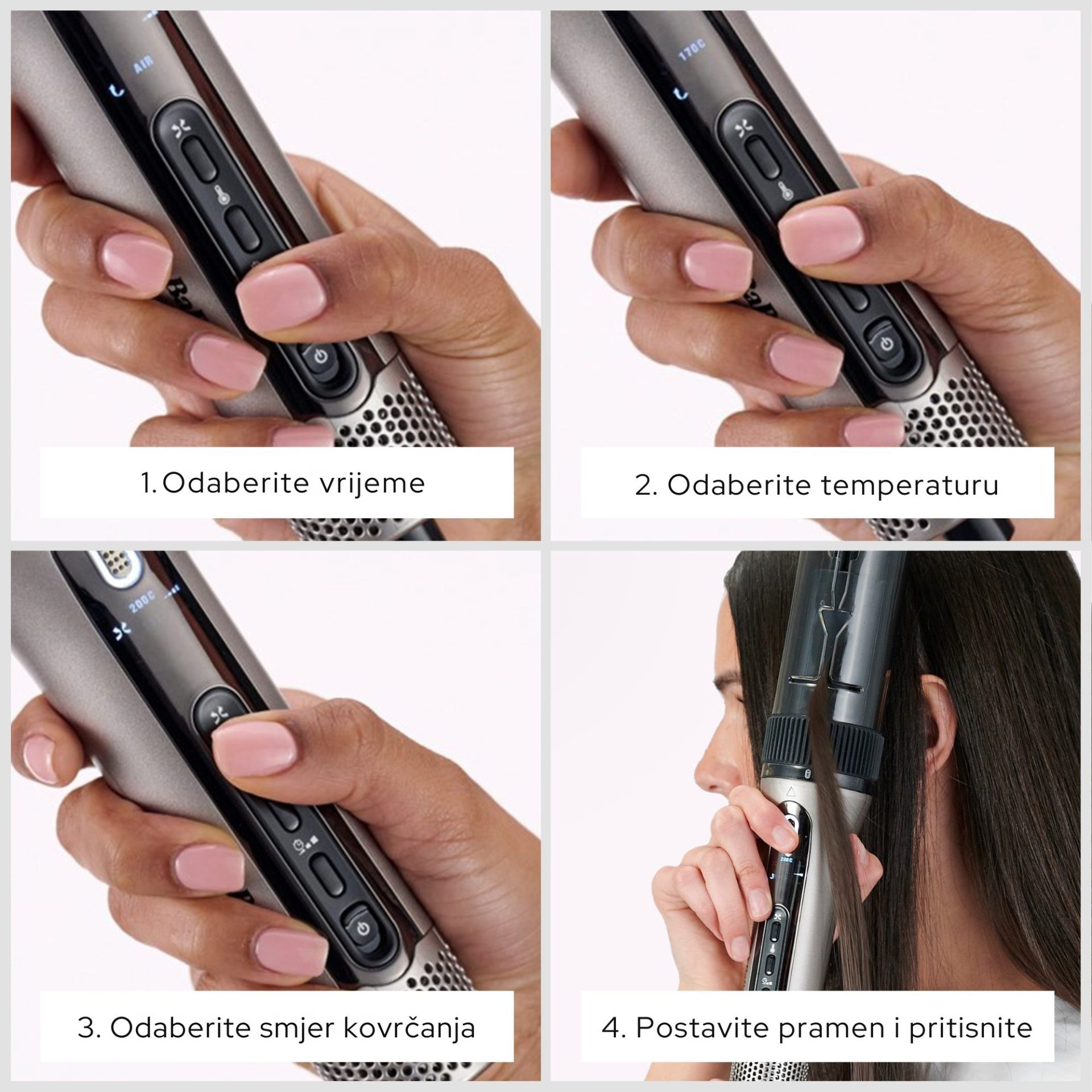 Birajte između 4 postavke topline/protoka zraka, 4 postavke vremena i 3 smjera uvijanja kako biste stvorili različite stilove — od blagih valova do jasno definiranih kovrča.